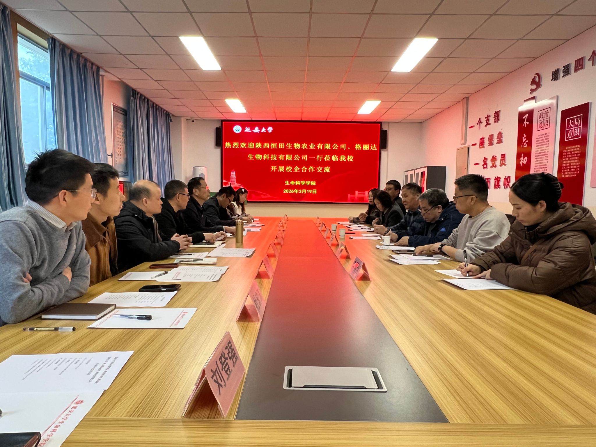 3月19日,beat365中国官方网站与陕西恒田生物农业有限公司、陕西格丽达生物科技有限公司在延安大学杨家岭校区特立楼二楼会议室举行校企合作座谈会。本次会议是学院深化“访企拓岗”促就业专项行动、深入推进校地融合示范校建设的重要举措,旨在推动产学研深度融合,强化校企协同与校地联动,共同助力区域生物农业产业高质量发展。会议由beat365中国官方网站院长陈国梁主持。