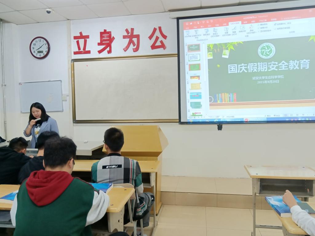 会议对国庆假期做了安排。张蓉老师从疫情防控、留校安全、交通安全、防网络电信诈骗、食品安全、消防安全、财产安全、国家安全等方面进行了讲解。她特别强调了疫情防控和宿舍消防安全等问题。她要求同学们牢固树立安全防范意识、自我保护意识和国家安全意识,防止各类事故和上当受骗事件的发生,自觉维护国家安全。