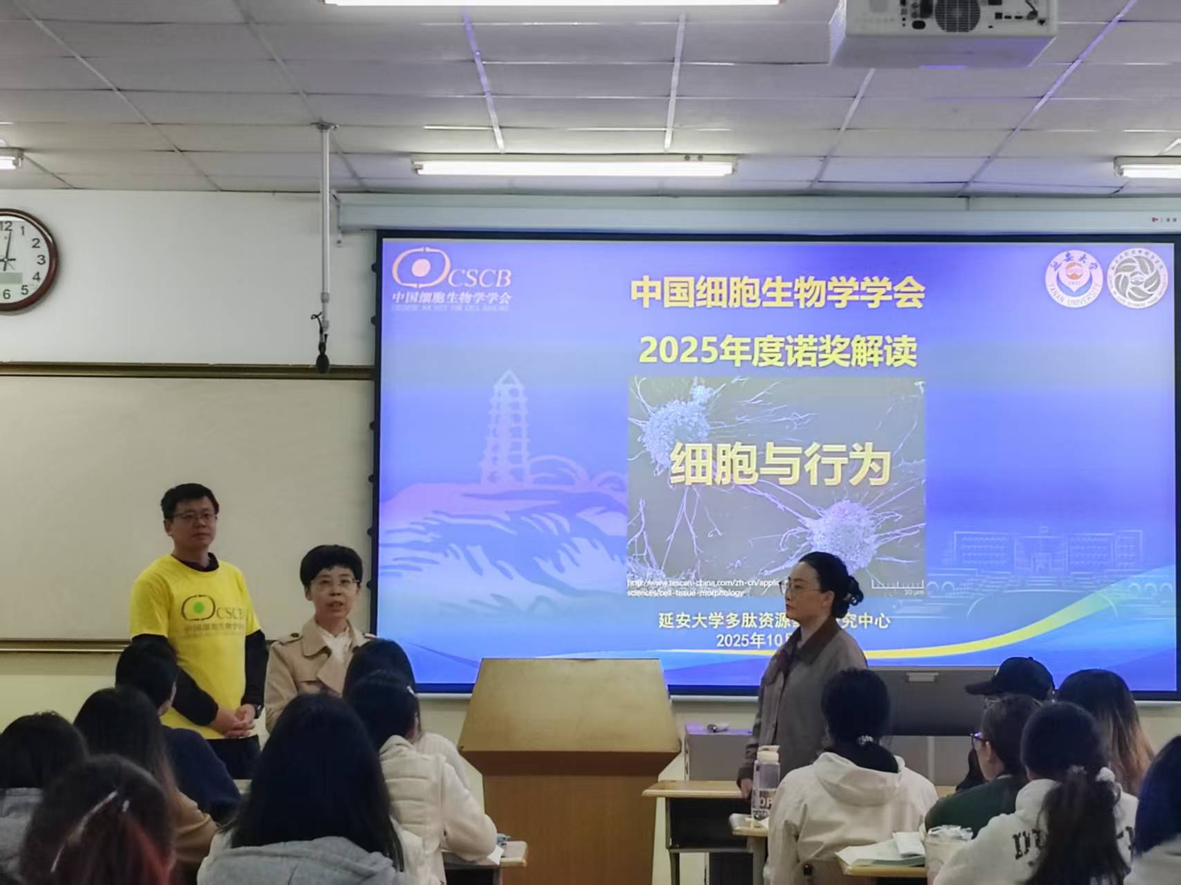 为加强落实新时代科学普及教育与中国细胞生物学学会关于开展全国“诺奖解读”活动倡议,2025年10月11日,中国细胞生物学会联合我校在杨家岭校区成功举办了以“细胞与行为”为主题的“诺奖解读”活动。此次活动由中国细胞生物学学会、中国神经科学学会、陕西省细胞生物学学会,陕西省区域生物资源保育与利用工程技术研究中心与beat365中国官方网站共同主办,延安大学多肽药物资源研究中心承办。延安大学在校学生76余人参加本次活动。
