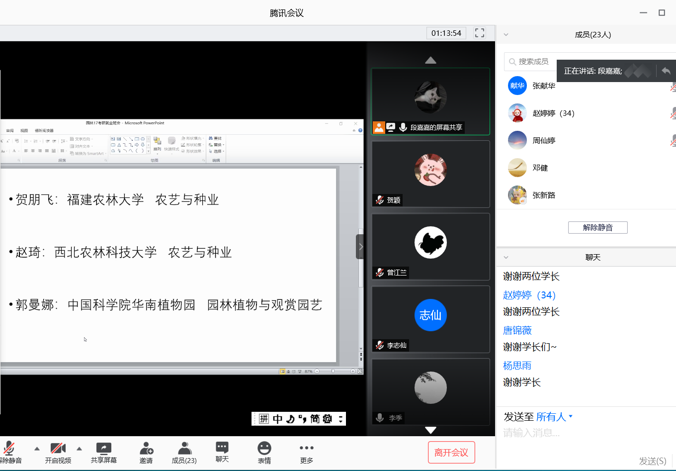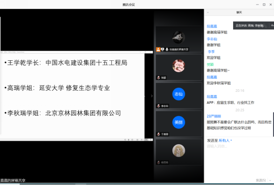 高瑞、贺朋飞、赵琦和郭曼娜四名同学分别考取了延安大学、福建农林大学、西北农林科技大学和中国科学院华南植物园的研究生,录取单位涵盖了本校、外校和科研院所,有专业型硕士也有学术性硕士,较好地涵盖了园林专业可能的考研方向。四名同学结合自己的考研准备过程向同学们分享了学校和专业的确定、个人考研规划的制定、考研准备期间心态的调整、专业课和公共课准备注意事项等方面的经验,并重点结合今年疫情期间在家复习的特殊情况,强调了要做好个人时间规划,严格约束自己,努力克服困难,及时调整心态。发言结束后同学们就自己的困惑与相关同学进行了深入,互动环节十分热烈。