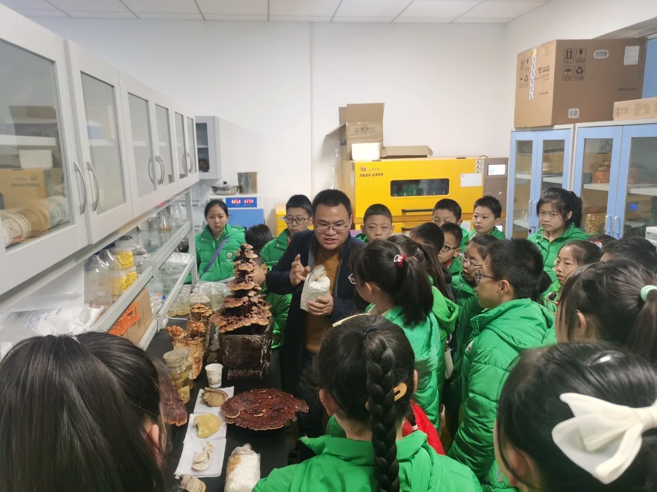 贺晓龙高级实验师对常见菌类标本、菌类分类、食用菌栽培、生长环境等进行了生动的介绍,让同学们切身感受了菌类的生长过程。孩子们在出菇房里看到神奇的蘑菇,有的细长挺拔,亭亭玉立,有的矮矮平平,扁头扁脑的,有的一袭白衣,宛若仙女......原来我们吃的蘑菇是这样培育出来的,孩子们看的兴致勃勃,学习热情高涨。