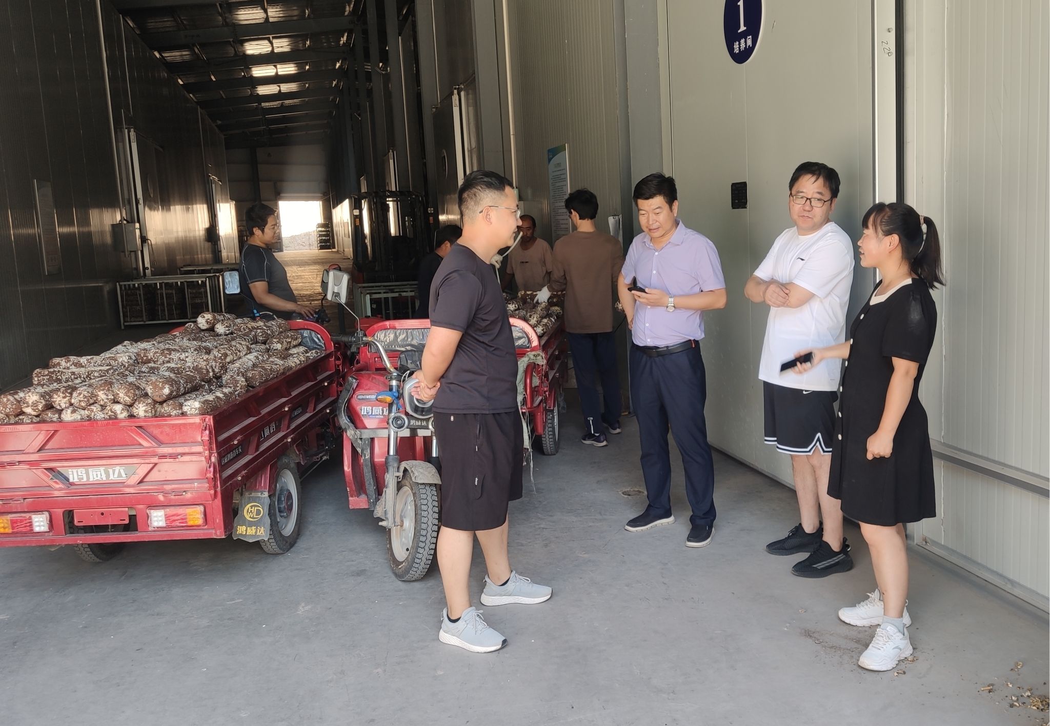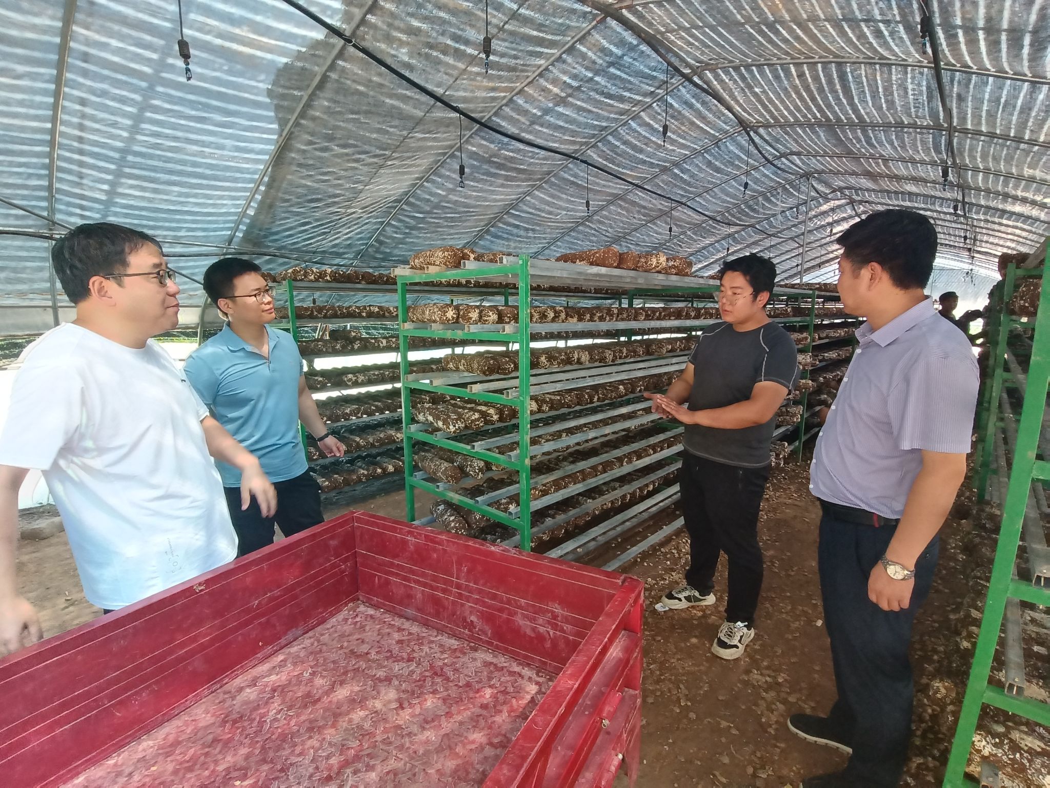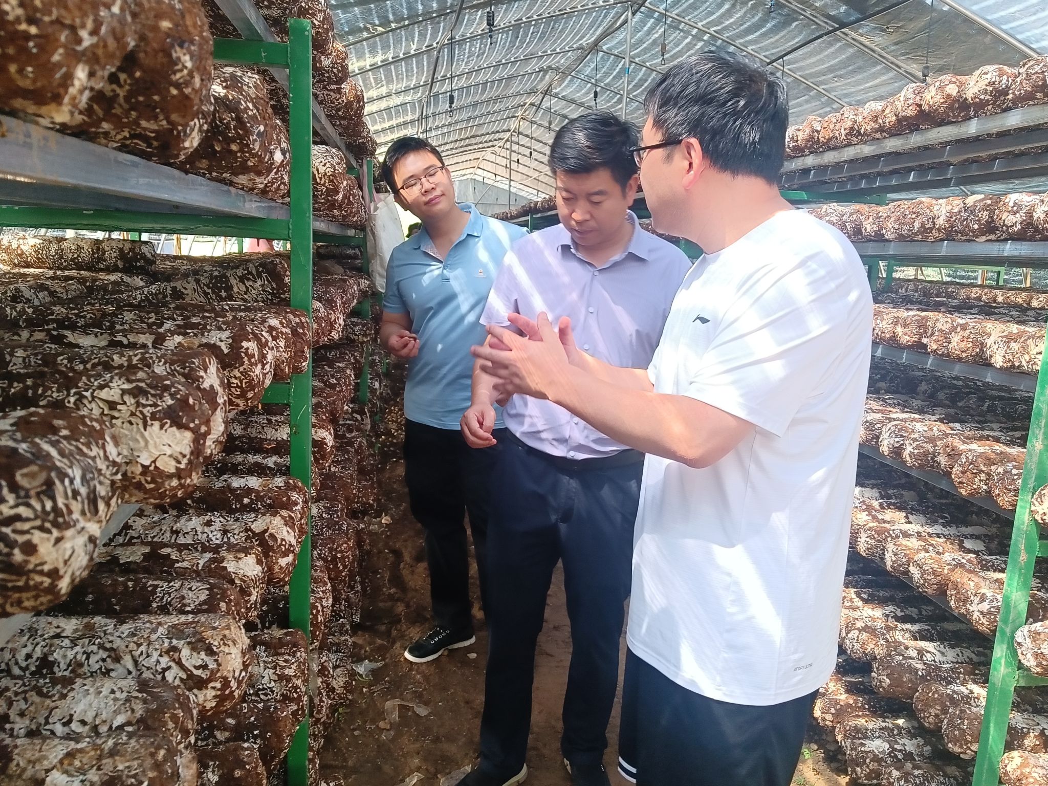 7月24日上午,beat365中国官方网站“三区”科技人才服务队刘冲、高小朋、邓健、靳鹏飞等4人前往河庄坪镇食用菌产业园区进行食用菌生产情况调研和科技服务。在延安菌舰生物科技有限公司总经理高瑜的带领下,beat365中国官方网站三区人才们详细了解了公司现阶段菌棒生产和销售情况,随后前往食用菌菌棒生产大棚,在棚里实地查看了当前菌棒生长情况,并就远距离运输过程中的菌棒存贮、香菇出菇条件控制等生产管理问题与负责人进行了沟通和技术指导。三区人才们在调研过程中还发现部分生产环节缺乏专业性工具等问题,通过现场交流和探讨,未来也会针对企业需求尝试改进和开发针对性的生产工具帮助解决实际难题。